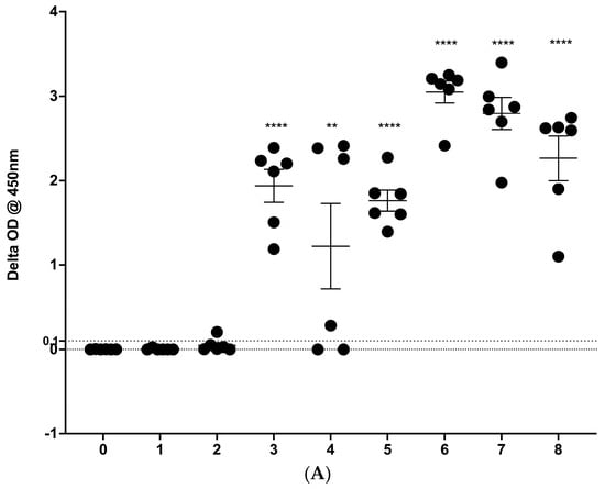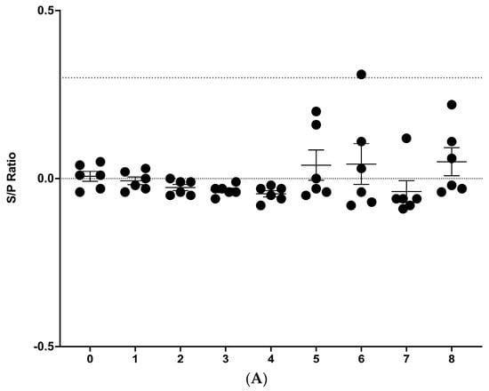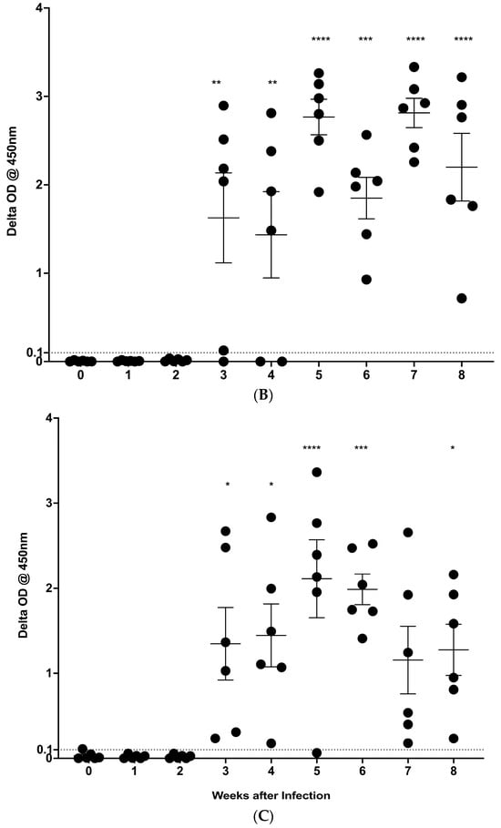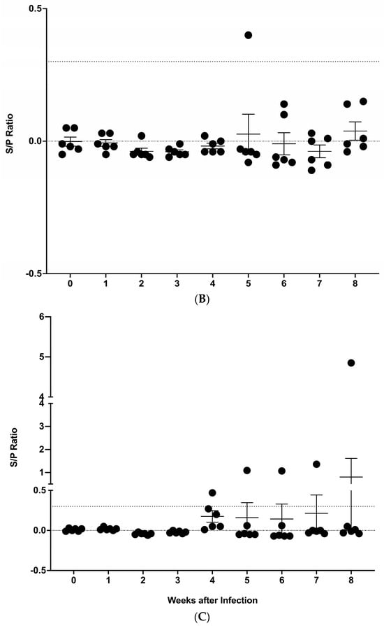 Seven days prior to infection and weekly thereafter for 8 weeks, blood was collected for the evaluation of humoral immune responses using a commercially available assay. The test was performed as per the manufacturer’s instructions (IDEXX Laboratories Inc., Westbrook, ME, USA). The samples, as well as kit positive and negative controls, were diluted 1:50 in Sample Diluent. The samples and controls were transferred to antigen-coated plates in duplicate. Plates were covered and incubated at RT for 1 h. After incubation, the plates were washed 3–5 times using the kit Wash Solution. Kit conjugate was then added, the plates were covered, and they were incubated for 30 min at RT. The plates were again washed and 3,3′,5,5′-tetramethylbenzidine (TMB) substrate added. The plates were covered and incubated for 15 min at RT, after which Stop Solution was added and the plates were read at 450 nm using an 800/TS microplate reader (Agilent BioTek, Santa Clara, CA, USA). The data are presented as an S/P ratio where the (ODsample−ODnegative control) is divided by the (ODpositive control−ODnegative control). A sample was considered positive if the S/P ratio was ≥0.30.