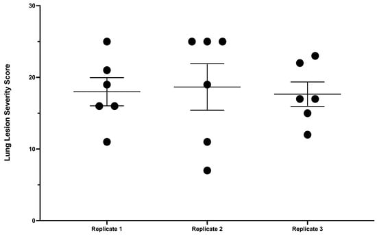 Samples collected for microscopic analysis confirmed that gross lesions were microscopically consistent with tuberculoid granulomas of bTB. Lung lesion severity scores were similar and did not differ significantly between replicates (Figure 3).