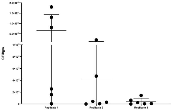 There were no statistical differences between replicates in the quantitative culture results from the caudal mediastinal lymph node (Figure 4), although there was greater variability observed in replicates 1 and 2 than that of replicate 3.