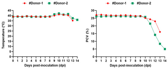 Body temperature and hematocrit (PCV) of donor goats experimentally inoculated by fresh blood infected with Babesia aktasi. #Donor-1 (●), #Donor-2 (■).
