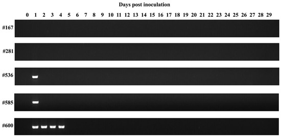 Following the inoculation of B. aktasi-infected blood, no clinical signs indicating the presence of babesiosis (fever, anemia, jaundice, and hemoglobinuria) were observed in the immune-suppressed recipient lambs over the monitoring period of 30 days. Rectal temperature and PCV were normal and stable. During this time, the intra-erythrocytic parasites of B. aktasi were not detected by microscopic examination of the Giemsa-stained blood smears. Surprisingly, no positive amplification products indicating the presence of the parasite DNA were also detected by nested PCR in the lambs #281 and #167 (Figure 3, Table 2). On the contrary, positive amplifications were detected in lambs #536 and #585 on the 1st dpi by nested PCR, and in lamb #600 up to the 4th day. However, these lambs tested negative by nested PCR in the subsequent days (Figure 3, Table 2).