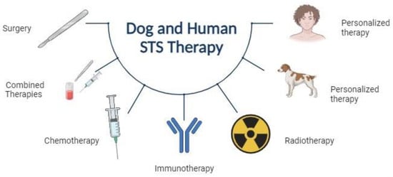 Despite considerable advancements in the characterization of STSs, the treatment of these tumors in both dogs and humans remains largely reliant on surgery, radiation therapy, and chemotherapy. The selection of an appropriate treatment depends on the size, location, and stage of the tumor, as well as the age and overall health of the patient. In dogs, complete surgical excision is the preferred treatment for STSs. However, adjuvant radiation therapy and chemotherapy may be necessary in cases of incomplete excision or metastatic disease [25]. The treatment of STSs in humans is more complex, necessitating a multidisciplinary approach. The main treatment approach is surgery with wide margins, but radiation therapy and chemotherapy may also be used in selected cases [26] (Figure 1).
