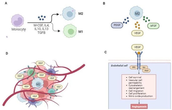 Tumor microenvironment in human and canine soft tissue sarcomas. (A) Tumor-associated macrophages (TAMs) can undergo two different polarizations, M1 or M2, starting from M0 populations defined as non-activated macrophages. M0 populations differentiate into the M1 subtype after stimulation with granulocyte–monocyte colony-stimulating factor (GM-CSF), lipopolysaccharide (LPS), or interferon-gamma (IFNγ). M2 polarization is activated by M-CSF, IL-4, IL 10, and IL 13, and it induces a pro-tumoral environment. (B) M2 can release signaling molecules and growth factors such as basic fibroblast growth factor (bFGF), platelet-derived growth factor (PDGF), and vascular endothelial growth factor (VEGF). (C) The activation of the VEGF pathway is responsible for angiogenesis and tumor growth. (D) VEGF can be used as a prognostic marker to predict tumor recurrence or survival in STSs. Indeed, there is a positive correlation between increased VEGF expression and a higher tumor grade. Moreover, TAMs negatively regulate cytotoxic effector cells, such as CD8+ and natural killer (NK) cells, and they often express programmed death-ligand 1 (PD-L1)/L2.