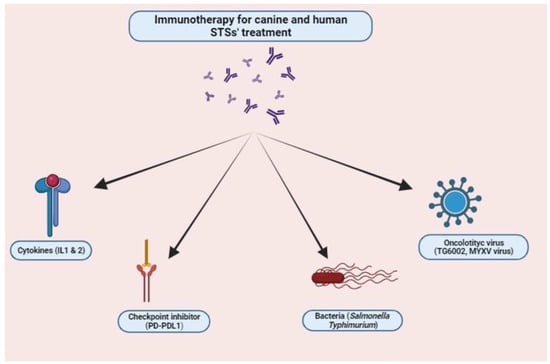 Another interesting approach to enhance antitumor immunity is the use of anaerobic bacteria. A genetically engineered Salmonella enterica serovar Typhimurium was evaluated against canine osteosarcoma [107,108]. Reduced toxicity and a prolonged disease-free interval (DFI) were observed compared with the control group. Salmonella was not observed in any of the tissues sampled, suggesting that the beneficial effects were mainly due to an antitumor immune response rather than direct tumoricidal activity of the vector. Indeed, lymphocytosis and monocytosis were observed in 18 out of 19 dogs 10 days after the first Salmonella administration. A recent study by Razzuoli and colleagues reported promising results following exposure of wild-type Salmonella typhimurium to the canine STS cell line A-72 [109]. Indeed, S. typhimurium invaded A-72 cells, inducing a pro-inflammatory response associated with a decrease in cell viability. After treatment, increased expression of CXCL8, NOS2, CXCR4, and PTEN was observed, while TP53 was slightly expressed, as shown in human STSs. Such results suggest the possibility of using a bacterial agent to stimulate the expression of important genes involved in the innate immune response. Even though further trials are needed, the study also provides a useful model for the in vitro evaluation of new therapeutic approaches that could be translated into human oncology [107]. Interest in oncolytic virus-based therapies is also growing in the scientific community. Beguin and collaborators reported the possibility of using TG6002, an oncolytic vaccinia virus expressing the FCU1 protein, which converts 5-fluorocytosine to 5-fluorouracil (a chemotherapeutic compound) to treat various canine tumors, including six patients with STSs [111]. According to the authors, effective viral replication, targeted intra-tumoral 5-FU production, and reversion of the immunosuppressive TME due to the immune response associated with TG6002 and 5-FC administration were confirmed. Le Beouf and colleagues [114] highlighted the appropriateness of the canine model by reporting the successful use of the oncolytic Maraba virus (MG1) to treat in vitro lines of human and canine sarcomas. Similarly, an attenuated MYXV virus was assessed as a possible therapeutic agent in canine STSs [113]. The authors injected the virus, coupled with oclacitinib, decreasing type I IFN and thus increasing MYXV replication in canine cancer cells. The injection was performed around the surgical site at two time points post-operatively to treat the residual tumor cells. The treatment did not appear to affect the rate of tumor recurrence in dogs, but it provided interesting insights into the combined use of oclacitinib, since it effectively increased MYXV replication.