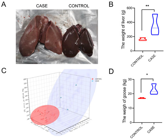 Phenotypic changes in liver and body weight after high-intake feeding in lion-head geese. (A) Goose liver in the groups of high-intake feeding and normal feeding. (B) The weight of liver. (C) The size of the goose liver. (D) The weight of goose (** p < 0.01; * p < 0.05).