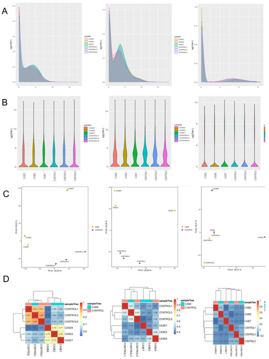 To obtain whole and accurate mRNA transcripts of the goose liver, we constructed six cDNA libraries (CASE2, CASE6, CASE7, CONTROL1, CONTROL3, and CONTROL) from liver tissue of lion-head geese. Using RNA-seq, we detected 21,008 mRNA transcripts, 3549 lncRNA transcripts, and 10,284 circRNA transcripts. Transcript expression was quantified using FPKM value [41]. The FPKM distribution of mRNAs is shown in Figure 2A, while the expression of different samples is displayed as a violin chart (Figure 2B). To effectively identify the most significant element and structures in the data, we represented the complex composition relationship of samples using horizontal and vertical coordinates [42]. This approach facilitated the exploration of the distance relationship between samples. The six samples were divided into two groups, which showed satisfactory repeatability (Figure 2C). Furthermore, we generated a hierarchical clustering diagram to visually depict the relationships between samples. Unsupervised clustering also confirmed the distinct expression patterns among liver tissues (Figure 2D). Sequences showed a reliable clustering effect, which ensured the veracity of the subsequent analysis [43].