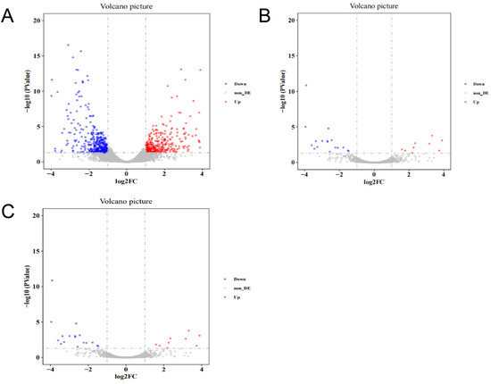 Identification and analysis of mRNA, lncRNA, and circRNA associated with fatty liver. (A) Volcano plots of DEGs in mRNA. (B) Volcano plots of DEGs in lncRNA. (C) Volcano plots of DEGs in circRNA. Each dot in the plot represents a gene with its corresponding log2 fold change (FC) on the x-axis and p-value (log10) on the y-axis. The horizontal line indicates the significance threshold (false discovery rate <5%), whereas the vertical line segregates genes with logFC >1.5. Gray represents no significant difference between the two groups, red indicates the upregulated genes, and blue indicates the downregulated genes.