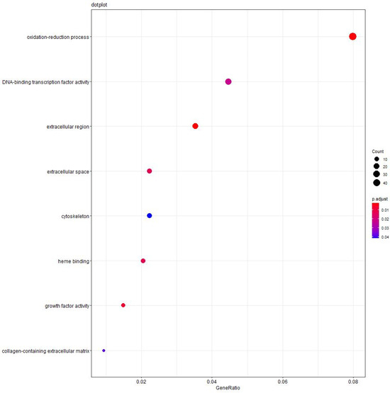 To gain a better understanding of the functions of these DEGs, we performed additional Gene Ontology (GO) analyses between high-intake-fed lion-head geese and normally fed lion-head geese [44]. The KOBAS tools were used to conduct GO enrichment analysis for the DEGs [45]. Our analysis revealed a significant enrichment of DEGs in the oxidation–reduction process. In brief, we initially identified the DEGs, followed by a functional enrichment analysis of these genes in the liver of high-intake-fed lion-head geese. Notably, the most enriched GO terms were oxidation–reduction process (GO.0005576) and DNA-binding transcription factor activity (GO.0003700). We employed the same methodology to predict the functions of the lncRNAs and circRNAs. The top three enrichment terms of the DEGs are oxidation–reduction process, DNA-binding transcription factor activity, and extracellular region. The top eight enrichment terms are presented in Figure 4, including oxidation–reduction process, DNA-binding transcription factor activity, extracellular region, extracellular space, heme binding, growth factor activity, and collagen-containing extracellular matrix.