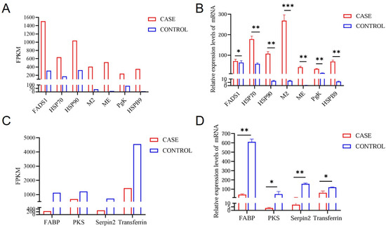 RNAs were extracted from liver tissue samples of the 3 CASE groups and 3 CONTROL groups for qRT-PCR verification. cDNA synthesis was performed using a Takara reverse transcriptase kit (Takara, Dalian, China) following the manufacturer’s instructions. Subsequently, qRT-PCR was carried out in a 20 μL reaction system comprising 10 μL of SYBR Green Master Mix (Vazyme, Nanjing, China), 0.5 μL of PCR forward primer (10 μM), 0.5 μL of PCR reverse primer (10 μM), 1 μL of cDNA, and 8 μL of enzyme-free water. The reaction system began to react at 95 °C for 3 min and then reacted at 95 °C (5 s) and 60 °C (34 s) for a total of 40 cycles. The reaction was carried out in three separate wells, with GAPDH as an internal reference, and the relative RNA expression level was calculated using the 2−ΔΔCt value [39]. A t-test was performed to determine statistical significance, and the results were presented as mean ± standard deviation. For validation, we randomly selected 11 differentially expressed mRNAs from the sequencing group, including 7 upregulated mRNAs (Gene ID: HSPB9, Pgk, Hsp70, ME2, malic enzyme, HSP90, FADS1) and 4 downregulated mRNAs (Gene ID: transferrin, FABP, PKS, Serpin2). The primer sequences for these 11 genes are provided in Table 1.