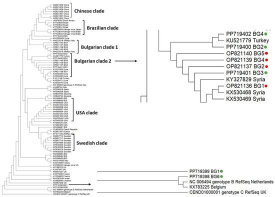 Figure 3. Phylogeny of Deformed wing virus (DWV) isolates from Bulgaria and other countries. The phylogenetic tree based on alignment of the fragment of RdRp gene sequences of DWV isolates from different countries was inferred by using the maximum likelihood method and the Tamura 3-parameter model and then selecting the topology with a superior log likelihood value [57]. The indicated branching topology was evaluated by bootstrap resampling of the sequences of 10,000 replicates. Each isolate is indicated by country of isolation and GenBank accession number. Bulgarian isolates identified by this study are presented in green and red [12].