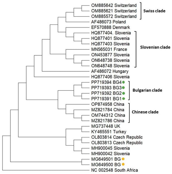 To analyze the phylogeny of the Bulgarian ABPV isolates, we sequenced a part of the replicase polyprotein coding sequence (431 bp) relative to the reference viral genome (Acc. No. NC 002548). Figure 4 demonstrates that the Bulgarian representatives clustered close to each other, which indicated the monophyletic origin (Bulgarian clade) with a relatively homogenous population of ABPV in the country. Similarly, Swiss and Chinese isolates also formed independent clades (Swiss and Chinese clades). The Slovenian representatives were dispersed throughout the phylogenetic tree, demonstrating the presence of quite heterogeneous populations of ABPV with multiple origins in Slovenia. Regarding the phylogeny of the Bulgarian ABPV isolates from Apis mellifera [54], it should be noted that they separated from that of the current study, showing that a mutation possibly occurred in the viral genome.