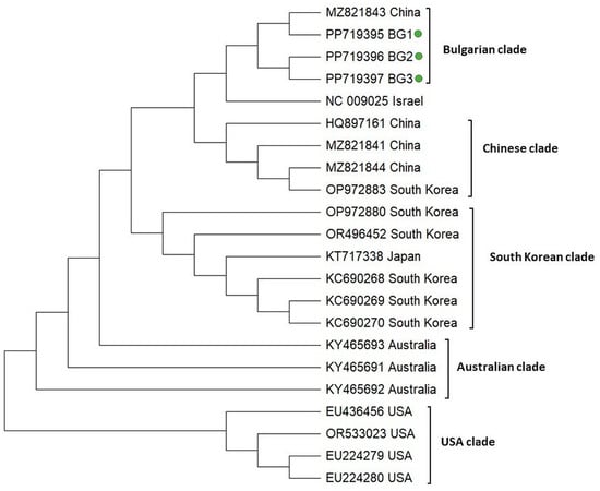 The phylogeny of IAPV was inferred on the basis of a 445 bp fragment covering the part of the replicase-associated protein region according to the reference viral genome (Acc. No. NC 009025). In a similar manner to the phylogeny of DWV, the IAPV isolates clearly demonstrated geographic separation and formed five clades (Bulgarian, Chinese, South Korean, Australian, and USA) (Figure 5). The Chinese, Australian, and USA populations showed monophyletic clustering, suggesting the existence of homogenous isolates in these countries. The Bulgarian population formed a separate clade that includes a representative of China (Acc. No. MZ 821843). The monophyletic clustering of Bulgarian genotypes along with the Chinese isolate suggests that they share a common origin and that relatively homogenous populations of IAPV exist in Bulgaria.