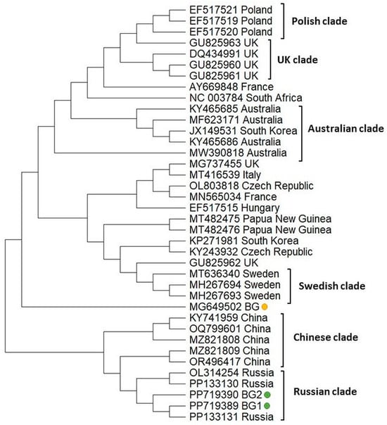 To infer the phylogeny of two Bulgarian BCQV isolates, we determined the 420 bp fragment encoding the nonstructural polyprotein (ORF 1); then, a phylogenetic tree was constructed with those of the other most similar isolates available in GenBank (Figure 6). The Bulgarian isolates were grouped close together with the Russian isolates. In contrast, the phylogenetic position of the Bulgarian isolate from Apis mellifera [54] demonstrated different clustering, suggesting that genetic distance exists between BQCV genotypes isolated from bee products and honey bees. The Polish, UK, Swedish, and Chinese representatives form separate clusters, suggesting low genetic diversity of the BQCV isolates from these countries. Slightly different is the phylogeny of the Australian clade, as it includes one isolate from South Korea (Acc. No. JX 149531). This indicates that these isolates share a common origin.