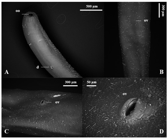 Scanning electron microscopy of the female Globocephalus urosubulatus (Alessandrini, 1909) recovered from 10 free-ranging wild boars in the northwest region of the State of São Paulo, Brazil. (A) Right latero-ventral panorama of the female, highlighting the oral opening (oo) and the right deirid (d). (B–D) Ventral view of the female with the opening of the vulva (ov).