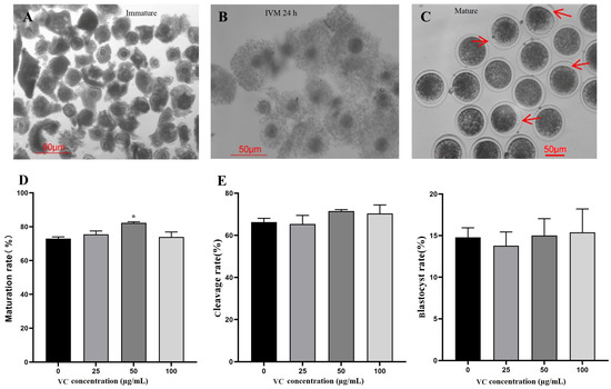 Effects of VC on bovine oocyte IVM and parthenogenetic embryo development. (A–C): Oocyte morphology at different stages (immature, IVM 24 h, and mature, respectively) was shown with arrows showing the first polar bodies; (D): IVM rates (oocyte number = 89, 78, 94, and 81 for different groups, respectively); (E): cleavage and blastocyst rates of the parthenogenetic embryos (oocyte number = 102, 96, 111, and 85, respectively). * p < 0.05; Scale bar = 50 μm.