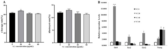 Since IVF embryos might have different responses to VC, its concentration gradient in IVC medium was adjusted to 0, 20, 40, and 60 µg/mL according to our preliminary experiments. The results showed that VC at 20 µg/mL increased the cleavage rate (Figure 2A, p < 0.05). For the blastocyst rate, no statistical difference was observed (Figure 2A, p > 0.05). Consistently, qRT-PCR analysis demonstrated that the mRNA expressions of the pluripotency-related genes Oct4, Sox2, Cdx2, and Nanog in blastocysts were remarkably enhanced by VC at 20 µg/mL (p < 0.05 or 0.001). Interestingly, supplementing VC at higher concentrations (40 and 60 µg/mL) did not show positive effects on the expressions of these genes (p > 0.05) except Nanog (Figure 2B, p < 0.05).