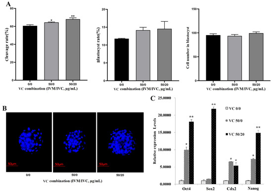 Accordingly, IVM solution containing 50 µg/mL VC + IVC medium −/+ 20 µg/mL VC (named as 50/0 group and 50/20 group) was applied as a combined strategy to examine the effects of VC on the development of IVF embryos, with none-supplemented IVM solution + IVC medium (0/0 group) as the control. The results revealed that the embryo cleavage rates were greatly increased both in the 50/0 and 50/20 groups (Figure 3A, p < 0.05 or 0.01). However, no significant difference in blastocyst formation and the cell numbers in blastocysts was observed (Figure 3A,B, p > 0.05). Further qRT-PCR analysis demonstrated that a VC combination of 50/0 and 50/20 dramatically enhanced the transcriptional expression of Oct4, Cdx2, and Nanog, while only VC 50/20 boosted Sox2 expression in bovine blastocysts (Figure 3C, p < 0.05 or 0.01).