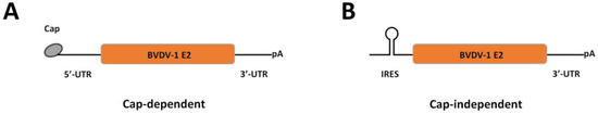 DNA plasmids encoding cap-dependent and independent RNAs were constructed using standard molecular techniques. The plasmid for cap-dependent expression was designed using the entire E2 gene of BVDV-1 as the open reading frame with a Kozak sequence flanked by the 5′UTR and 3′UTR (Figure 1A). Following the addition of the prokaryotic T7 promoter before the 5′UTR and a poly(A) sequence after the 3′UTR, the whole fragment was cloned into a pUC57 vector to replace the lacZ region using NdeI and BspQI restriction enzymes. The same strategy was utilized to drive the cap-independent protein synthesis, but an optimized Coxsackievirus B3 (CVB3) internal ribosome entry site (IRES) described previously [26] was engineered upstream of the start codon of the E2 gene to substitute the 5′UTR and part of the Kozak sequence (Figure 1B).