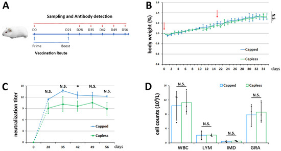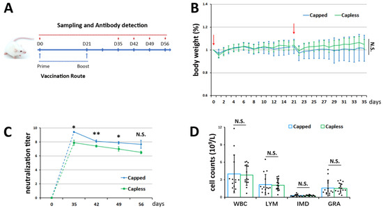 Efficacy of mRNA vaccines in the mouse model. (A) Timeline of experimental design in the mice. (B) Normalized body weight of immunized mice (n = 15 for each group). Red arrows indicate vaccination (first dose) and booster (second dose). (C) Neutralizing antibody titers against BVDV-1 determined at days 0, 35, 42, 49, and 56 based on immunofluorescence inhibition (n = 3, each for sera sample combined from 5 mice). (D) Effects of vaccination on leukocytes (WBC), lymphocytes (LYM), intermediate cells (IMD), and granulocytes (GRA) on day 56 (n = 15 presented as black dots for each group). N.S. indicates that there was no significant difference between the capped and capless vaccine, * p < 0.05, ** p < 0.01.