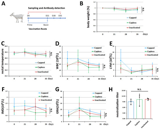 Efficacy of mRNA vaccines in goats raised on a natural farm. (A) Timeline of experimental design in adult goats. (B,C) Histograms for body weight (B) and rectal temperature (C) of immunized goats (n = 3 per group). (D–F) Effects of vaccinations on clinical pathology characterized by WBC (D), LYM (E), IMD (F), and GRA (G) on days 0, 21, 28, and 35 (n = 3). (H) BVDV-1 antibody production on day 35, measured using a serum neutralization assay (n = 3 presented as black dots for each group). N.S., not significant.