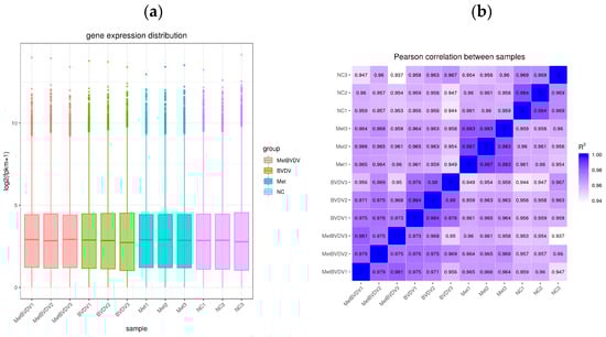 To ensure that the sequencing results had biological and statistical significance, we ensured the accuracy and relevance of the results. We performed three biological repetitions of every sample and obtained 4.2 Gb of available data. The Q20 was greater than 97% for the clean data, and the GC content was between 53.05% and 55.77% (Table 2). Gene expression levels from RNA-seq are generally expressed as FPKM values, which are influenced by depth and length; therefore, FPKM values can be normalized to sequencing depth and gene length. After calculating the expression levels (FPKM values) of all genes in each sample, we used box diagrams to visualize the different samples and gene expression levels (Figure 2a). These values are important indicators of the relationship of the sample for which gene expression levels were measured and the accuracy of the measurement.