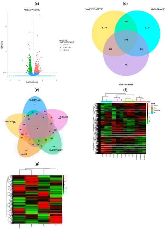Differential gene expression analysis. (a): Difference comparisons depicted as histograms of combined differences in gene number statistics. Blue and gray indicate upregulated and downregulated DEGs, respectively. (b): DEG volcano map for the Met vs. NC groups. (c): Volcano map of DEGs between the MetBVDV and BVDV groups. The abscissa in the figure is the log2-fold change value, the ordinate is the −log10 padj or −log10 p value, and the blue dotted line represents the threshold line of the DEG screening criteria. (d): Venn diagram of DEGs between the MetBVDV and BVDV groups. (e): Venn diagram of DEGs for all combinations. (f): DEG clustering heatmap; the abscissa is the sample name, and the ordinate is the normalized value of the DEG FPKM. (g): Clustering heatmap of DEGs. Red indicates high expression, and green indicates low expression.