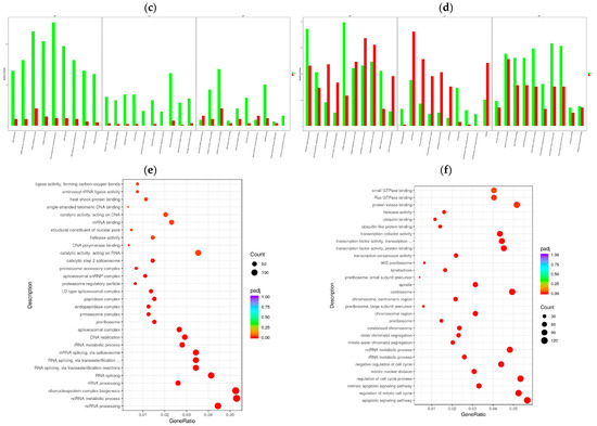 To determine the cellular response to BVDV infection, we performed enrichment analyses to annotate gene function and provide the most detailed information on the KEGG pathways. GOtools was used to conduct GO enrichment analysis of the DEGs among the comparison groups, and histograms were constructed with the GO terms as horizontal coordinates and the enrichment rates as vertical coordinates. The results revealed that the DEGs selected in each comparison group were associated with three categories: biological process (BP), cellular component (CC), and molecular function (MF). For GO functional enrichment, a padj less than 0.05 was used as the threshold. The DEGs selected in the Met vs. NC comparison group were significantly enriched in the ncRNA metabolic process, ribonucleoprotein complex biogenesis, rRNA processing, RNA splicing, RNA splicing via transesterification reactions, the spliceosomal complex, the proteasome complex, and catalytic activity acting on RNA. The DEGs identified in the MetBVDV vs. BVDV comparison group were significantly enriched in the apoptotic signaling pathway, the regulation of the mitotic cell cycle, the intrinsic apoptotic signaling pathway, and the negative regulation of the cell cycle, among others (Figure 4a,b). We selected the 30 most significant terms from the GO enrichment analysis results and generated a histogram according to these three major categories and the upregulated and downregulated DEGs (Figure 4c,d). We also chose 30 significant terms from the GO analysis to create scatter plots. The size of the dot represents the number of genes, and the color from red to purple represents significant enrichment (Figure 4e,f).