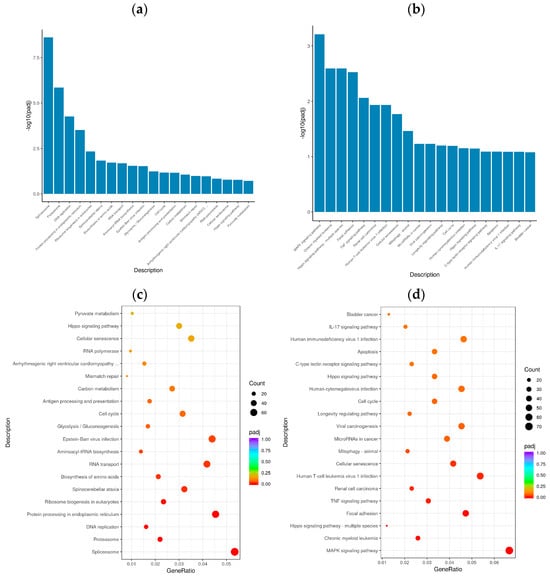 In organisms, genes do not function alone; rather, they often interact with each other to form various metabolic and signal transduction pathways. KEGG pathway enrichment analysis helped elucidate the biological functions of the DEGs and the biological systems of active cells after BVDV infection. KOBAS 2.0 was used to perform a KEGG pathway analysis of the DEGs of the different comparison groups. The KEGG pathway was used as the abscissa, and the enrichment rate was used as the ordinate to construct a histogram. KEGG pathway enrichment analysis revealed 20 significantly enriched signaling pathways in the Met vs. NC and MetBVDV vs. BVDV comparison groups (Figure 5a,b). Significant enrichment for the Met vs. NC comparison group was observed in the spliceosome signal transduction pathway, the protein processing signaling pathway in the endoplasmic reticulum, the aminoacyl-tRNA biosynthesis signaling pathway, the cell cycle signaling pathway, cysteine and methionine metabolism, NF-κB, sphingolipid, MAPK, the autophagy signaling pathway, and endocytosis, whereas for the MetBVDV vs. BVDV comparison group, significant enrichment was indicated for the Hippo, TNF, mitochondrial autophagy, the C-type lectin receptor, and the PI3K-Akt signaling pathways (Figure 5c,d). Thus, the GO and KEGG pathway enrichment analyses identified at least 20 signaling pathways.