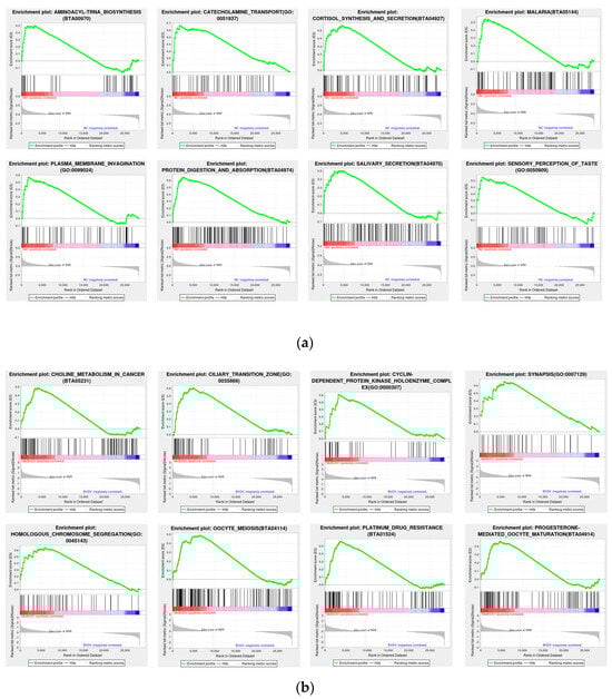 To prevent the omission of genes that were not significantly differentially expressed yet had significant biological importance, we employed GSEA. GSEA utilizes a predefined gene set to rank the genes on the basis of their differential expression levels in two types of samples and subsequently examines whether the preset gene set is positioned at the top of the ranking list or enriched at the bottom. The results for the Met vs. NC group revealed that the addition of Met was related to aminoacyl-tRNA biosynthesis (BTA00970), catecholamine transport (GO: 0051937), cortisol synthesis and secretion (BTA04927), malaria (BTA05144), plasma membrane invagination (GO: 0099024), protein digestion and absorption (BTA04974), salivary secretion (BTA04970), and sensory perception of taste (GO: 005090). The results of the MetBVDV vs. BVDV comparison revealed that combined Met treatment and BVDV infection, compared with BVDV infection alone, was related to choline metabolism in cancer (BTA05231), the ciliary transition zone (GO: 0035869), the cyclin-dependent protein kinase holoenzyme complex (GO: 0000307), synapsis (GO: 0007129), homologous chromosome segregation (GO: 0045143), oocyte meiosis (BTA04114), platinum drug resistance (BTA01524), and progesterone-mediated oocyte maturation (BTA04914) (Figure 6a,b). All of the above results indicated that Met significantly altered several vital pathways.
