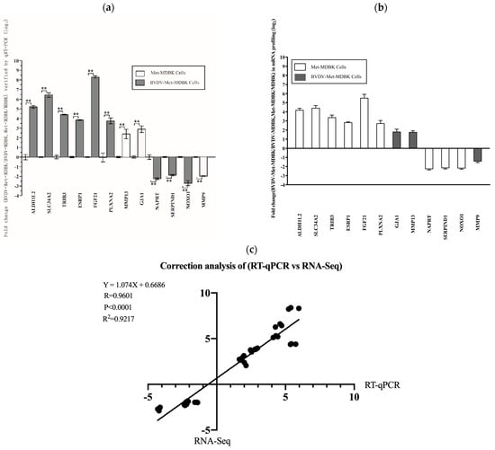 Relative expression of DEGs validated by qPCR. (a): Expression levels of 12 genes validated by qPCR. The GAPDH gene was used as an internal control, and the relative quantity of gene expression (fold change) of each gene was calculated via the comparative 2−ΔΔCT method. (b): Fold change in the expression of 12 randomly selected DEGs according to RNA-seq-based transcriptomic profiling of MDBK cells. The data are expressed as the log2 (fold change) and are shown as the mean ± SD. n = 3. (c): Correlations of the fold changes according to the data obtained via qPCR (x-axis) with the RNA-seq platform (y-axis). The asterisks indicate statistical significance according to the Student’s t test (**, p < 0.01).