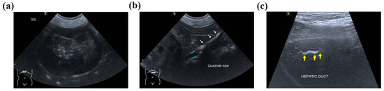 Abdominal radiography revealed radiopaque material suggestive of cholelithiasis in the liver, GB, and CBD area. Ultrasonography (US) showed a mucocele in the GB (Figure 1a) and hepatolithiasis in the left medial, quadrate, and right liver lobes and the GB (Figure 1b,c). The intrahepatic bile duct was dilated with a diameter of approximately 3.3 mm. Distal CBD dilatation was not observed.