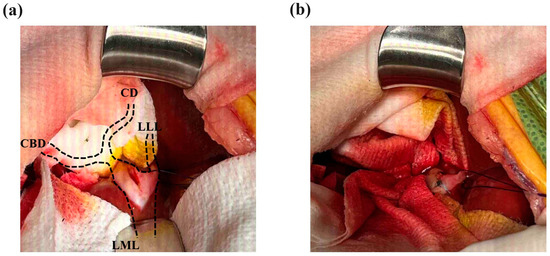 The dilated hepatic duct was packed off with wet gauze, and an incision was made on the most dilated section of the intrahepatic duct, which was the proximal aspect of the largest gallstone. The incision was performed 5 mm parallel to the intrahepatic duct’s longitudinal axis (Figure 3a). When the intrahepatic duct was incised, the tied suture knot was raised to create tension from the bottom of the left lateral hepatic duct to the top to prevent gallstones from passing into the hepatic duct of the left lateral liver lobe. Immediately after the incision of the hepatic duct, the largest gallstone was removed using vascular DeBakey thumb tissue forceps, and then, the hepatic duct was flushed and suctioned using a 5 to 6 Fr feeding tube and a 0.35 Fr Tomcat catheter with the guide removed. After removal of the intrahepatic cholelithiasis and bile, the hepatic duct was apposed with simple continuous 5-0 monofilament absorbable (polyglyconate) sutures (Figure 3b). Two gallstones in the CBD were removed by retrograde flushing into the GB using duodenal enterotomy, and a cholecystectomy was performed. After confirming hemostasis and no bile leakage from the surgical site, the abdominal cavity was flushed with warm 0.9% normal saline, and the abdominal wall and skin were closed.