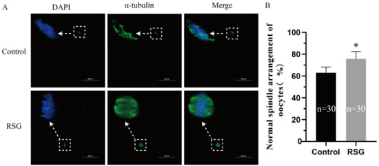 Effects of RSG on oocyte (MII stage) maturation. (A) Representative images of the spindles of oocytes treated with RSG by immunofluorescence staining. (B) Ratio of normal spindles in RSG-treated oocytes. “*” indicates significant difference.