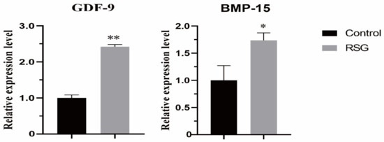 Effect of RSG treatment on mRNA expression of paracrine-related genes in oocytes. “*” indicates significant difference; “**” indicates difference is extremely significant.