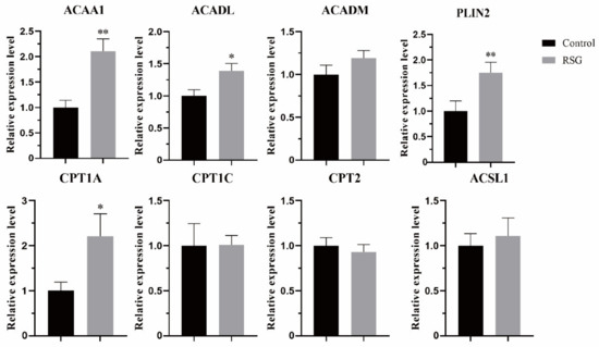 As shown in Figure 5, after increasing PPARγ activity, the mRNA expression of lipid metabolism-related genes changed as follows: the mRNA expressions of ACAA1 and PLIN2 were significantly increased (p < 0.01), the mRNA expressions of ACADL and CPT1A were significantly increased (p < 0.05), and the mRNA expressions of ACADM, CPT1C, CPT2 and ACSL1 were not changed (p > 0.05).