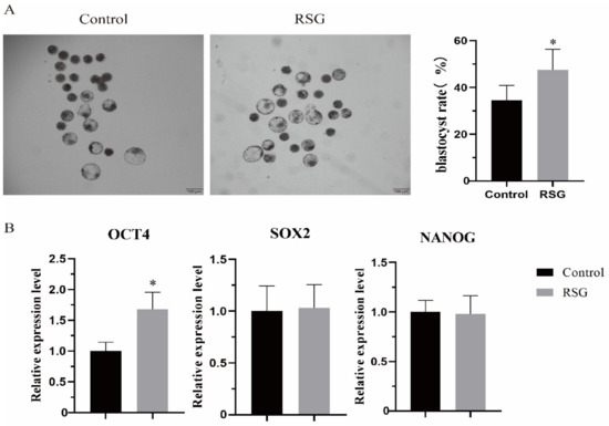Effects of RSG treatment on parthenogenetic activated embryo development. (A) Representative picture of RSG-treated blastocyst development and normal blastocyst rate. (B) RSG-treated mRNA of genes involved in maintaining embryonic cell pluripotency and self-renewal. “*” indicates significant difference.