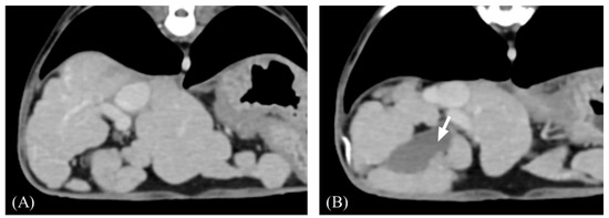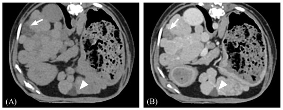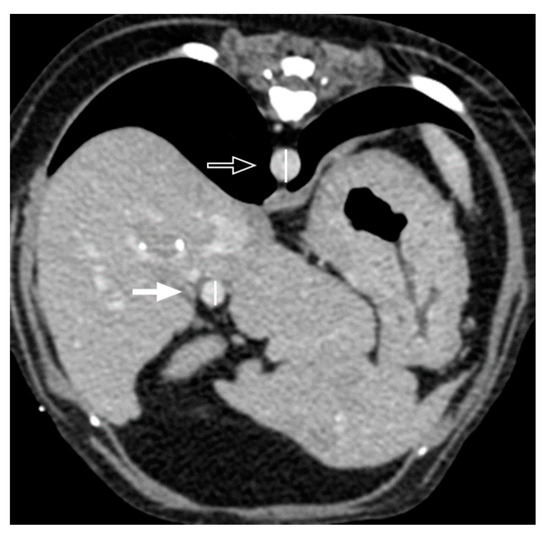 Quantitative CT features included the attenuation value (HU) of the nodules and hepatic parenchyma, portal vein-to-aorta ratio (PV/Ao), and normalized hepatic volume (cm3/kg). The attenuation values of the nodules and hepatic parenchyma were measured at least five times in three different nodules to evaluate reproducibility. The mean value with standard deviation was used for evaluation and statistical analysis. If nodules were identified in the general hepatic parenchyma, ROIs > 15 cm2 were used to measure the attenuation value of the hepatic parenchyma. If nodules were focally identified in a specific lobe, they were compared with the hepatic parenchyma in the lobe where the nodules were not identified. The PV/Ao ratio was measured at the level of the porta hepatis on DP images (Figure 2). Hepatic volumetry was performed as described previously [21,22]. For single-phase scans, post-contrast images were used, while for three-phase scans, AP and PP images were used for further CT volumetric calculations. Over 20 cross-sections were manually drawn from the cranial margin of the liver at the diaphragm to the most caudal margin of the liver to measure the area of the hepatic parenchyma. Cross sections were selected as follows: 1, 1.25, 1.3, and 2.5 slice thicknesses drawn at two or three slice intervals for small dogs; 3.75, 3.9, or 4 slice intervals for medium-sized dogs; and 5 mm slice intervals for large dogs. Vessels in the hepatic parenchyma were included, whereas the extrahepatic portal vein, caudal vena cava, gall bladder, and extrahepatic bile duct were excluded. If the distinction between the pancreatic and liver parenchyma was unclear on the PP image, AP cross-sectional images were used (Figure 3). Hepatic volume was calculated using Equation (1) [21,22]: