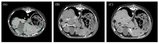 Portal venous phase (A,C) and arterial phase (B) transverse abdominal CT images for hepatic volume measurement. (A) The liver margin was manually drawn as a region of interest (ROI; green lines), including intrahepatic vasculature. The gallbladder, caudal vena cava (closed arrowhead), and extrahepatic portal vein (open arrowhead) were excluded from calculations. (B,C) The pancreas (asterisk) was clearly distinguished from the hepatic parenchyma in the AP, while the hepatic parenchyma and pancreas were indistinguishable in the PP (arrow).