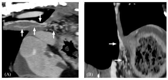 Post-contrast computed tomography images of esophageal varices. (A), sagittal plane. (B), dorsal plane. Note that tortuous small collateral veins (arrow) along the esophagus.