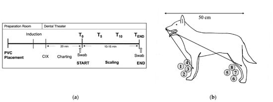 (a) Study protocol timeline. CIX: chlorhexidine; Induction: induction of general anaesthesia; T0, T5, T10, TEND: time points for closure of sedimentation plates (study part A); Swab: time of dorsal peripheral intravenous catheter (PIVC) injection port swabbing (start and the end of the procedure, study part B). (b) Schematic drawing of the experimental setup of a dog positioned for dental scaling: the arrows show how the distance from the nose to the PIVC placement sites was measured for the cephalic vein (CV) and the saphenous vein (SV) and the positions of the sedimentation plates (grey and labelled 1–8); double-headed arrow above the dog shows how was the length of the dog measured (from nose to base of the tail).