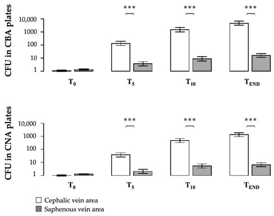 Results of part A. Number of colony-forming units (CFU) per time point (T0, T5, T10, TEND) on CBA (clindamycin blood agar, selective for Gram-negative bacteria) and CNA (Columbia naladixicacid agar, selective for the growth of Gram-positive bacteria) at the cephalic vein (CV) (light columns) and the saphenous vein (SV) (dark columns), measured during dental scaling in dogs (n = 39). Data are presented as mean ± standard error of the log-transformed data. The average of the CFU counted per time point and allocation (CV vs. SV) was used for the statistical analysis (one-way ANOVA). Significance was set at p < 0.05. *** CFU differ significantly (p < 0.0001) between the CV and the SV at the measured time point.