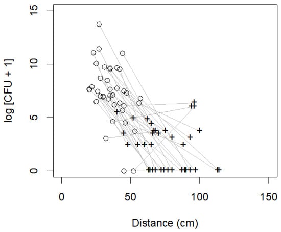Results part A. Scatterplot of distance from the nose to the cephalic (open circles) and saphenous vein (crosses) areas of the dogs (n = 39) during dental scaling on the x-axis and bacterial colony-forming unit (CFU) counts of the CBA (Gram-negative-selective agar) plates on the y-axis at time point 10 (10 min into dental scaling); grey lines connect the two samples belonging to the same dog. With an increasing distance from the mouth, the CFU counts decreased (T10), except in 4 animals.