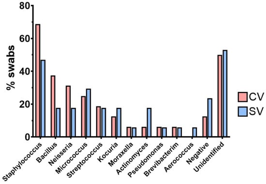 The most commonly recovered bacteria at the injection ports belonged to the genera Staphylococcus, Neisseria, Bacillus, and Micrococcus. Staphylococcus species were retrieved from 64.2% and 41.1% of the total swab samples in the CV and SV groups, respectively, while Neisseria, Bacillus, and Micrococcus species were each found in 35.7% and 17.6%, 35.7% and 17.6%, and 21.4% and 29.4% of the total number of sampled CV and SV injection ports, respectively. No Escherichia coli or other coliforms were recovered from the PIVC injection port samples. Of all the bacteria sampled at the dorsal PIVC injection ports, 51% exhibited the growth of bacteria that could not be identified using the MALDI-TOF MS library (Figure 4).