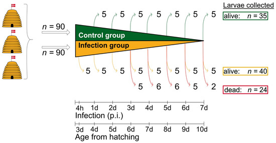 In each run, 20 larvae (n = 180) from each of three A. mellifera colonies were transferred to 48-well plates at the age of approx. 12 h after egg hatching, with each larva placed in a separate well containing a drop (10 µL) of basic larval food (BLF; 50% (v/v) royal jelly and 50% (w/v) aqueous solution in demineralized water (12% (w/v) D-fructose, 12% (w/v) D-glucose and 2% (w/v) yeast extract)). Every 24 h, the larvae were transferred individually to wells with fresh food. The amount of food was increased by 10 µL every day. Randomly selected larvae (n = 90) were infected with A. apis spores according to the standard method described by Jensen et al. 2013 [18]. The larvae were infected on the second day after removal from the colony (i.e., on day 3 after egg hatching) by first feeding the larvae of the infection group (n = 90) with spore-contaminated food (5 µL BLF with 2 × 105 A. apis spores/mL BLF) and 5 h later giving them 15 µL spore-free BLF (final amount 20 µL). Infection thus occurred with approximately 1 × 103 spores per larva. The food ((5 + 15) µL BLF) of the control group (n = 90) was always spore-free. Both groups received only spore-free food from the following day onwards. At the start of metamorphosis, the midgut connects with the hindgut, the larvae defecate for the first time, and the feeding phase ends. At this point (approximately day 6 p.i.), the larvae were transferred to wells lined with filter paper without food for the further course of the now-beginning pupal phase. They remained in the wells until day 14 p.i., the end of the experiment, to ensure that any previously undescribed effects of A. apis infection on pupal stages were not overlooked.