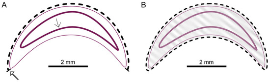 Schematic overview of the measurements. (A) Cuticle (thin pink line); cranial mouth opening (thick open arrow); intestinal epithelium (thick pink line with thin arrow); measurement to mouth-after length (dashed line). (B) Area measurement (hatched); © Tammo von Knoblauch.