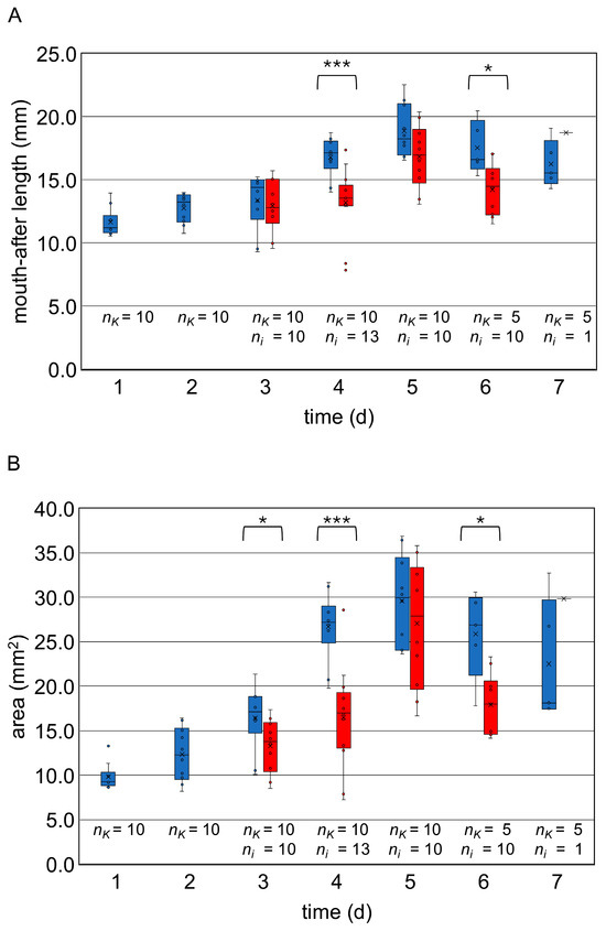 Boxplots (medians, interquartile range, minimum, maximum, outliers) for the length of the larvae in mm (A) and the area in mm2 (B) at the collection times 4 h p.i. to 7 d p.i. The control group (blue) and the infected larvae (red) are shown. Statistical analysis was performed by Mann–Whitney-U test. Statistical significances are represented by asterisks (*, 0.05 < p < 0.01; **, 0.01 < p < 0.001; ***, 0.001 > p). The number of measurements from the control larvae (nK) and the infected larvae (ni) was specified. The decline in size between day 5 and day 6 (larval age 8–9 days) reflects the connection between midgut and hindgut with the following defecation. © Tammo von Knoblauch.