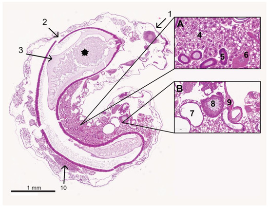 Median section of a control larva at the age of 4 days. The cuticle (1) is located on the surface. The midgut (2) is lying centrally and is filled with ingesta (*), surrounded by the peritrophic matrix (3). Cranially lies the brain (behind 1). Between the midgut and the cuticle, fat body cells fill the body cavity (section A number 4). In between are single oenocytes (section A, number 6). An ovary (10) is visible dorsally of the midgut. Ventral to the midgut are sections of the Malpighian tubules (section B, number 7) and the silk glands (section A, number 5). Tracheae are occasionally visible (section B, number 9). At the caudal end, the hindgut is not yet connected to the midgut (section B, number 8); © Tammo von Knoblauch.