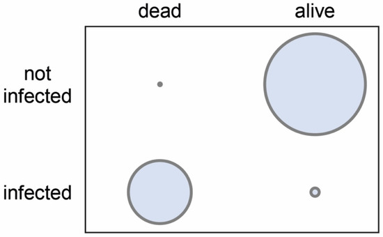 2D diagram visualizing the cross-tabulation values for the Chi2 test, which was applied for the analysis of the relationship between the two variables of larval status (dead/alive) and infection status (infected/not infected).