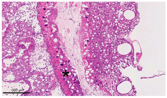A section of a dead larva at 4 d p.i. collected from the infection group (HE staining). The larva was heavily infiltrated by fungal mycelium, but tissue structures are still well preserved. Strong cytoplasmic droplet protrusions of the intestinal epithelium were visible (star); © Tammo von Knoblauch.