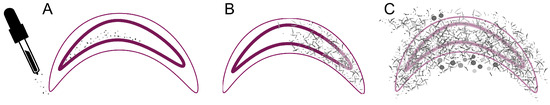 Schematic overview of the different stages of infection (Cuticle: thin pink line; intestinal epithelium: thick pink line). (A) Feeding of the larvae (infection group) with spores and ingestion of the spores. (B) Germination and spreading of the A. apis hyphae (black) in the caudal part of the larva. (C) Larva is completely interspersed with fungal mycelium, the cuticle is perforated, fruiting bodies (grey balls) are present, and tissue is destructed. © Tammo von Knoblauch.